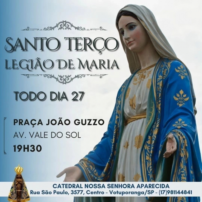 Mensalmente no dia 27, a Legião de Maria realiza a recitação do Santo Terço na praça João Guzzo, localizada na av Vale do Sol em Votuporanga. A celebração aberta à toda comunidade tem início sempre às 19h30.
