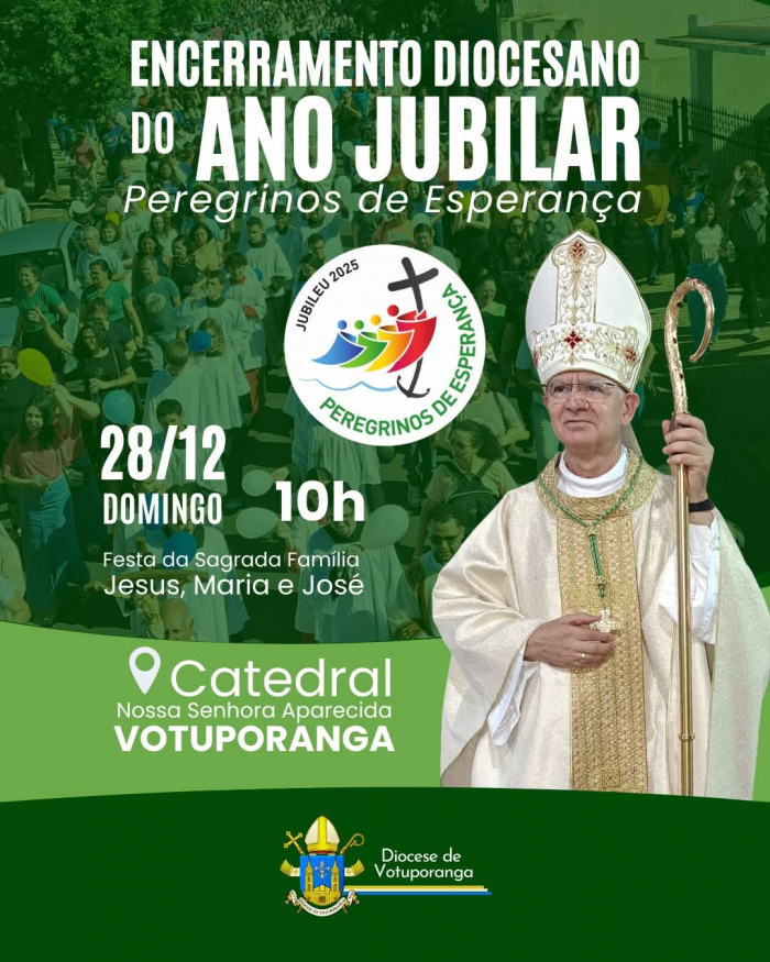 A Diocese de Votuporanga convida os fiéis a participarem do encerramento Diocesano do Ano Jubilar – Peregrinos de Esperança. No dia 28 de dezembro (domingo), às 10h, na Catedral Nossa Senhora Aparecida, culminaremos a nossa peregrinação jubilar celebrando a Festa da Sagrada Família, Jesus, Maria e José, num momento de ação de graças por todo o caminho vivenciado neste ano santo.