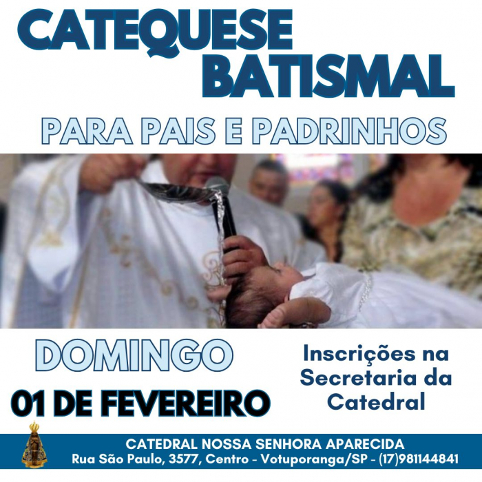 Estão abertas as inscrições para a Catequese Batismal para Pais e Padrinhos que será realizada no dia 01 de fevereiro de 2026. O encontro tem início às 7h30 no Salão Paroquial e as inscrições devem ser feitas na Secretaria Paroquial. Mais informações pelo telefone: (17) 3421-6245 ou (17)98114-4841.