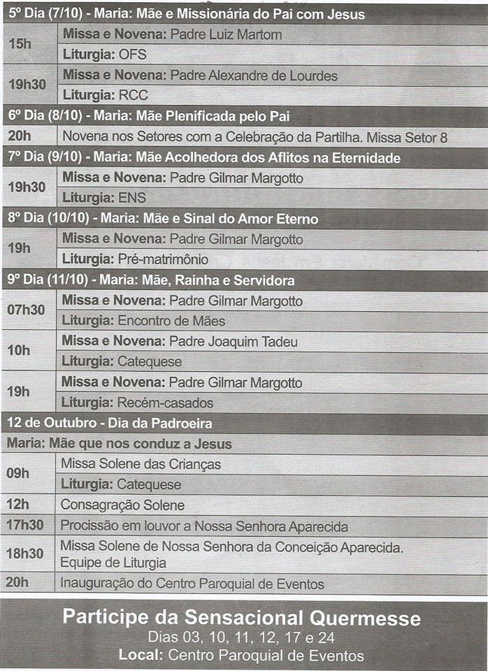 A Tradicional Quermesse será realizada nos sábados do mês de outubro e em especial no domingo, dia 11, e na segunda-feira, 12. Durante o período de Quermesse também é realizado o tradicional Concurso Boneca e Boneco Vivos, nos quais as crianças aprendem a colaborar com a Igreja desde pequenas.