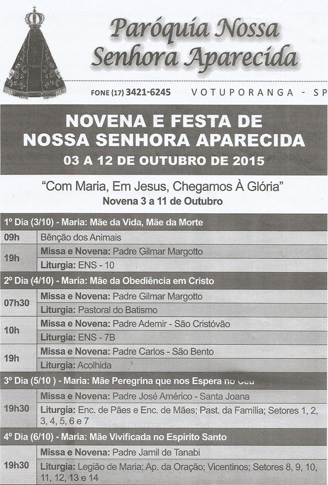 A Comunidade Paroquial da Igreja Matriz de Votuporanga está realizando as Festividades em honra à Padroeira Nossa Senhora Aparecida. De 3 a 11 de outubro será realizada a Novena, sendo presidida cada dia por um padre de Votuporanga e região. No dia 12, dia de Nossa Senhora Aparecida, serão celebradas Missas às 9h e 18h30, sendo esta última iniciada com a procissão às 17h30. As Festividades tem como tema neste ano "Com Maria, em Jesus, chegamos a glória" .No Dia da Padroeira, também será inaugurado o Centro Paroquial de Eventos.
