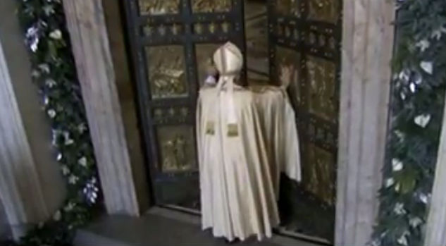 Ao final da Missa, o Papa Francisco dirigiu-se à Porta Santa da Basílica de São Pedro. Após uma breve oração, subiu os degraus em silêncio e com três toques abriu a Porta Santa, dando início ao Ano da Misericórdia.