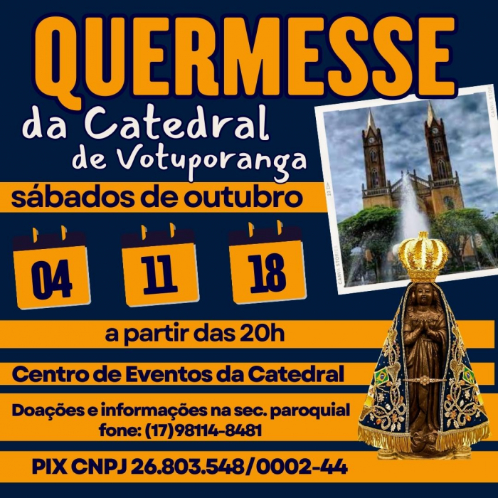 A Sensacional Quermesse em Louvor a Nossa Senhora Aparecida será realizada nos sábados 04, 11 e 18 de outubro, no Centro Paroquial de Eventos da Catedral.