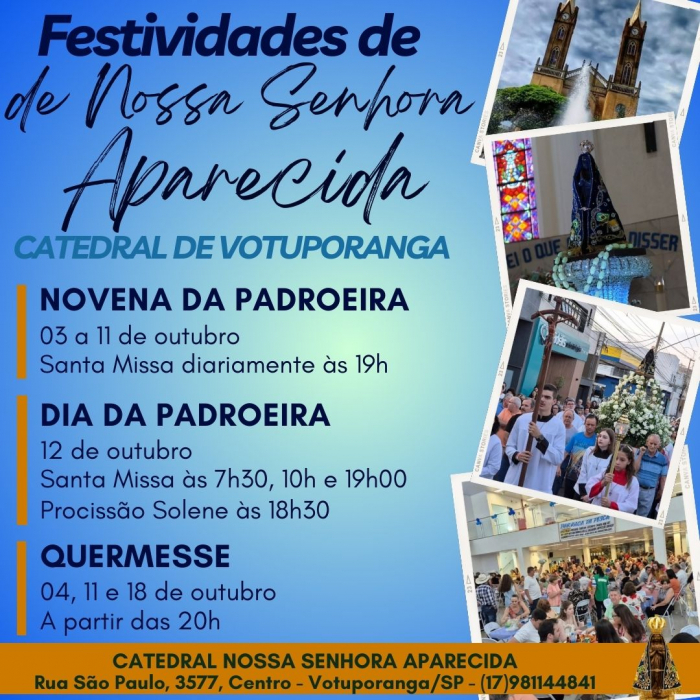 A Comunidade Paroquial da Catedral Nossa Senhora Aparecida de Votuporanga convida a todos para as festividades em Honra da Padroeira, que acontecerá no mês de outubro. De 3 a 11 de outubro será realizada a Novena, sendo presidida cada dia por um padre de Votuporanga e região. No dia 12, dia de Nossa Senhora Aparecida serão celebradas Missas às 07h30, 10h e 19h, sendo esta última iniciada com a procissão às 18h30.
