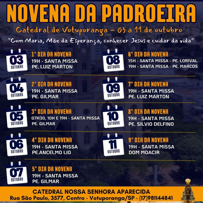 Nesta sexta-feira, 03 de outubro, a Catedral Nossa Senhora Aparecida de Votuporanfga inicia as celebrações das Festividades da Padroeira com a Novena de Nossa Senhora Aparecida. Em 2025, a Festa tem como tema: “Com Maria, Mãe da Esperança, conhecer Jesus e cuidar da vida”