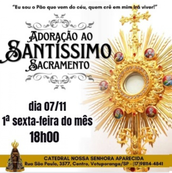 Como de costume em toda 1ª sexta-feira do mês, no dia 07 de novembro, será realizada a Adoração ao Santíssimo Sacramento às 18h na Catedral.