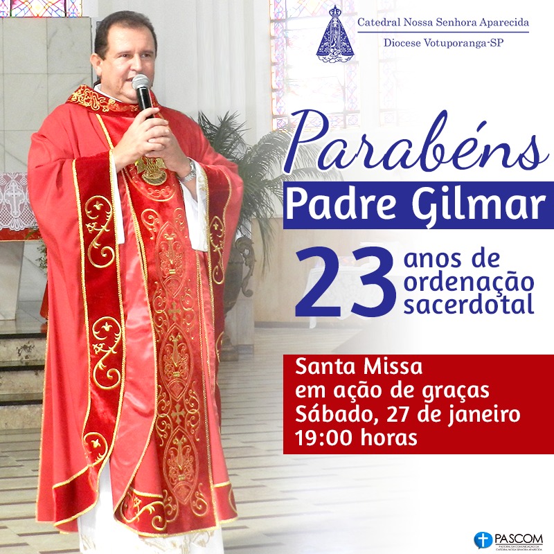 O padre Gilmar Antônio Fernandes Margotto, pároco da Catedral Nossa Senhora Aparecida, completa neste sábado os seus 23 anos de vida sacerdotal. Para celebrar a data, uma missa em Ação de Graças será realizada no sábado às 19h, na Catedral de Votuporanga.