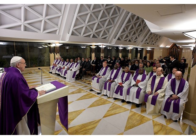 “Então, como eu disse, o exame de consciência, para ver o que ocorre. Mas sempre diante do Cristo crucificado. A oração. E depois, fará bem fazer-se uma fratura, não nos ossos: uma fratura nas atitudes confortáveis: as obras de caridade. Estou confortável, mas vou fazer isso, que me custa. Visitar uma pessoa doente, ajudar alguém que precisa… não sei, uma obra de caridade. E isso rompe a harmonia que procura fazer esse demônio, esses sete demônios com o chefe, para fazer a mundanidade espiritual”.